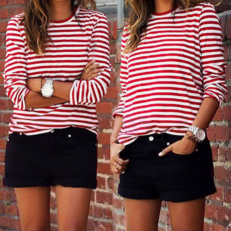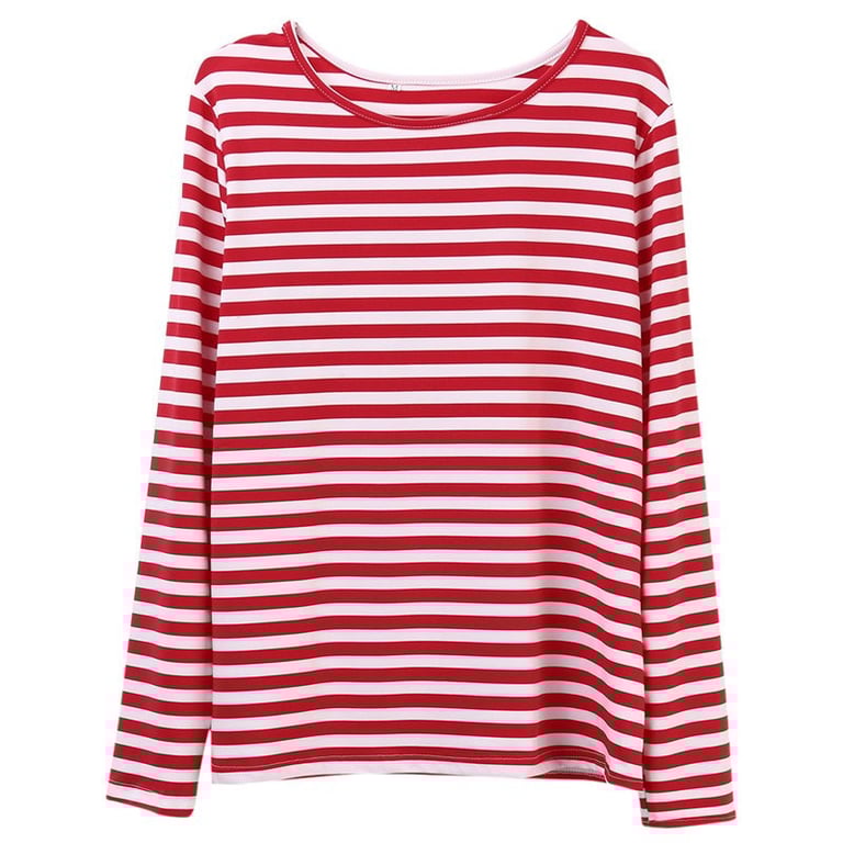 T-shirt femme à manches longues et col rond. Le t-shirt a une coupe ample et un motif rayé rouge et blanc. Matière confortable et agréable.