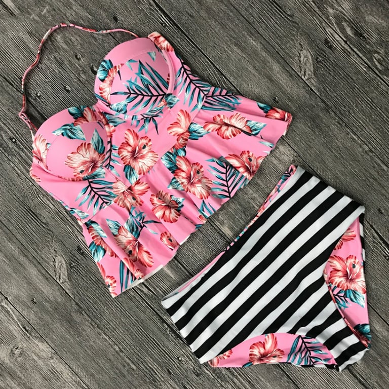 Maillots de bain tankini pour femmes avec imprimé estival. Haut à fines bretelles et volant. Bas à taille haute, réversible.