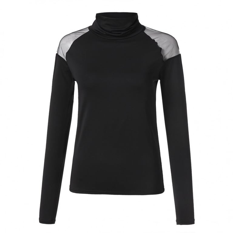 Top pour femme avec décolleté et col roulé. Le top a des manches longues en tissu transparent. Coupe ajustée.