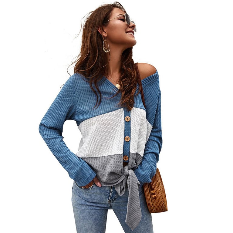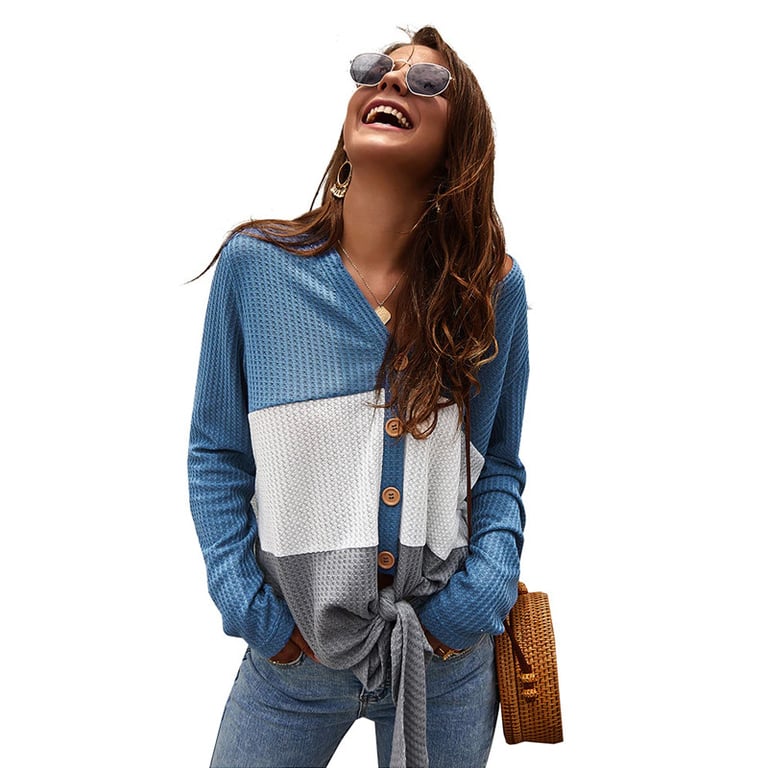 Top avec un lien attrayant, des boutons et un tissu à motifs. Choisissez parmi des couleurs agréables pour votre tenue d'automne.