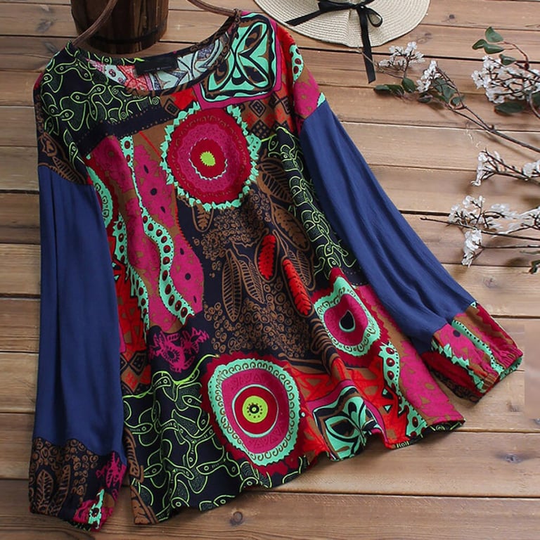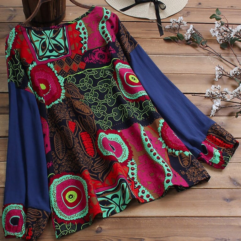 Blouse tunique pour femme avec un motif coloré. Coupe ample avec des manches longues et un col rond. Disponible en deux variantes.