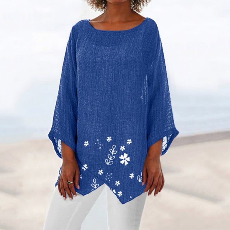 Blouse tunique pour femme avec des manches 3/4 et un col rond. Coupe longue et ample. Imprimé floral. Disponible en plusieurs couleurs.